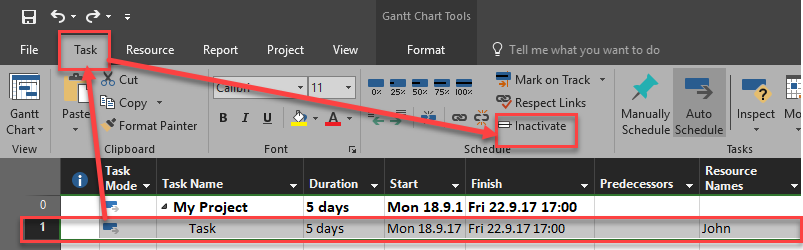 Now, let’s say that I do not need this Task any more, but I want to keep it shown in my Project. I will try to make it as Inactive, like this: