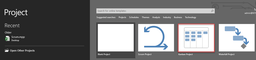 When you open MS Project you can choose that you want to run Kanban Project: