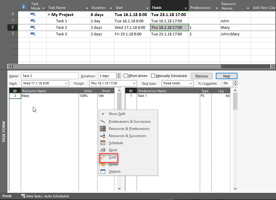 Task Form is very useful thing in MS PROJECT 2016, and it can be use in various ways. Today I’ll show how to see Costs for Task per Resource.
