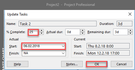 OK! Let’s say that Task 1 has started as Scheduled and it was done 25%: