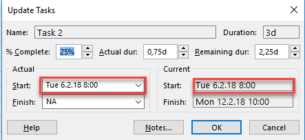Now, let’s say that Task 2 is also done 25%, but it has started two day earlier (e.g. 6.2.2018). Do not ask me how can is it possible that Task 2 has started before Task1 is finished. It is scenario.