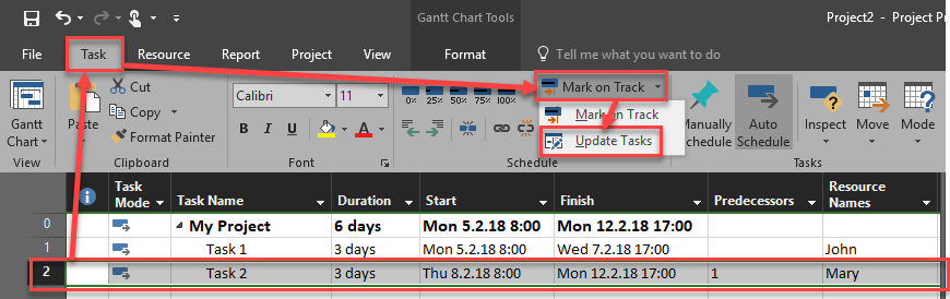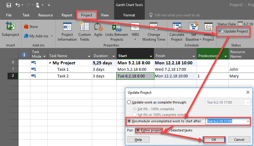 Now, I will set Status date to 06.02.2018, and I will update the project to reschedule uncompleted tasks to after the Status Date: