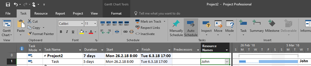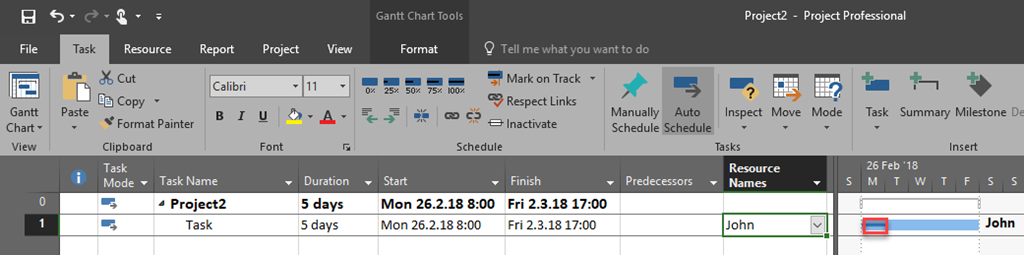 Now, let’s say that John couldn’t work on Tuesday and Wednesday, because it was, for example, lack of electricity. The Task will be delayed. But ho to do it in MS PROJECT?