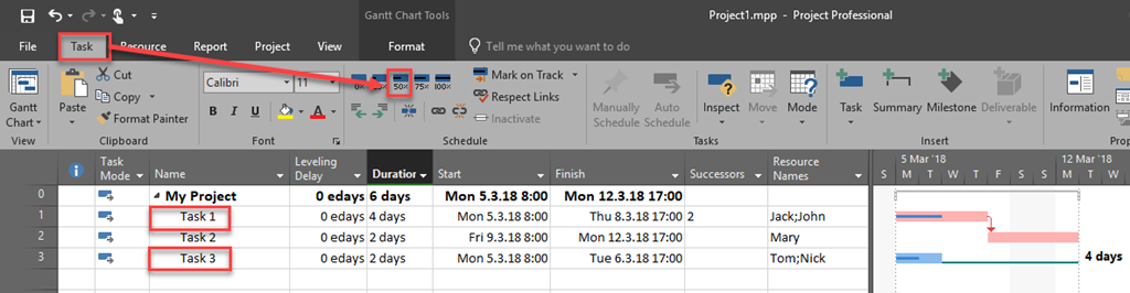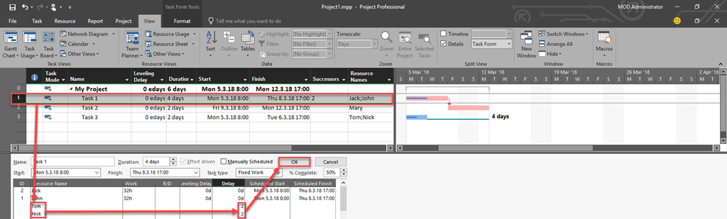 I should not do anything on Task 3, because I need Tom and Nick to work on this Task. But, as you can see, they are supposed to finish their work on Task 3 at Tuesday, 6.3.2018. so they are available to work on Task 1 at Wednesday, and Thursday (e.g. from 07.03.2018 – 08.03.2018). so I have to put them on that Task in that period. But! Since I want to decrease the duration of the Task 3, I will make that Task – fixed work, because if Tom and nick will help Jack and John on this particular Task, and the Duration will be decreased, in that case they will split the work, and therefore this Task is Fixed Duration.