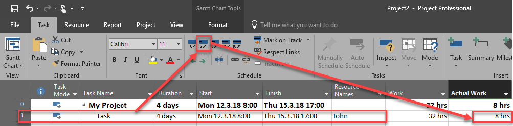 - Then we put 25% complete, which means that Actual work is 8 hours (1 day), and remaining work is 32 – 8 = 24 hours. So far, so good