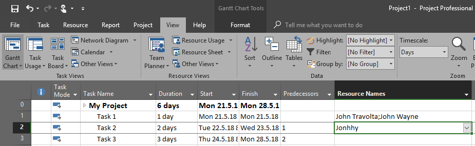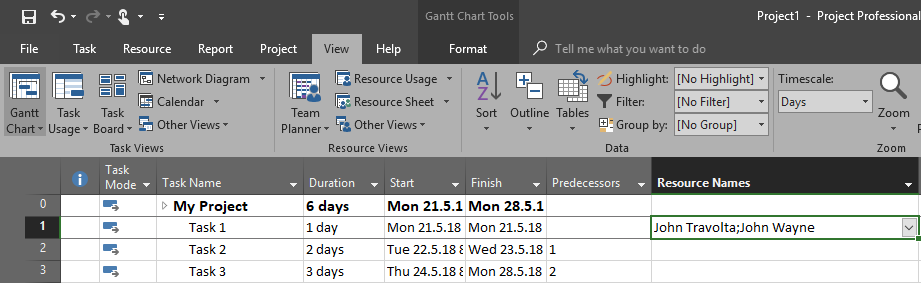 Now I will assign some of them to the Task 1 through Gantt chart View: