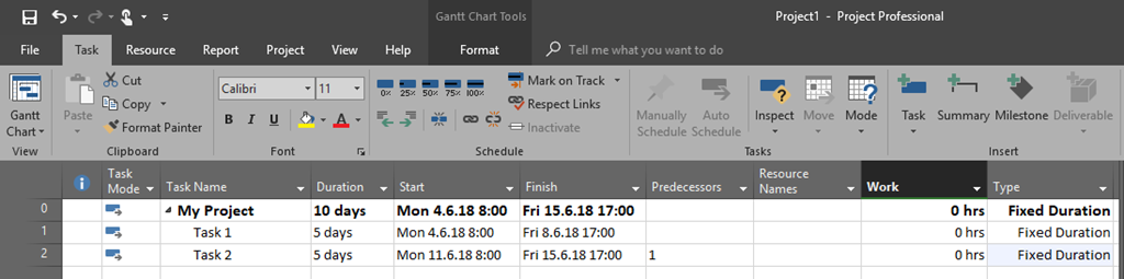 First I will create simple Project with two Tasks (both Fixed Duration Type):