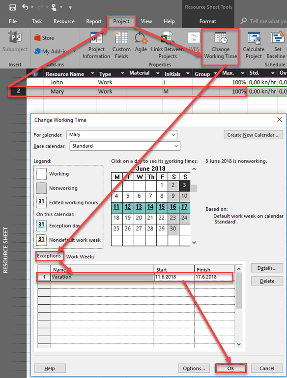 Now I will create two Resources, John and Mary, and I will put for Mary Vacation (e.g. non working time) from 11.06.2018 to 17.06.2017: