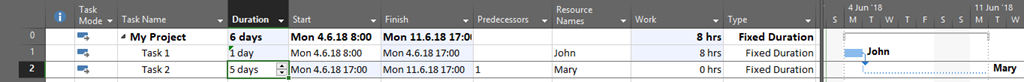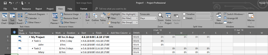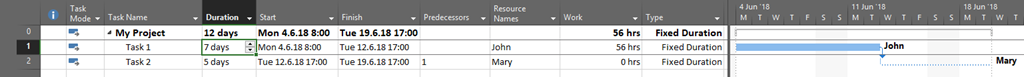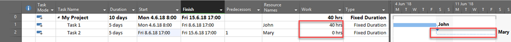 As you can see Work for the Task 1 is 40 hours (as expected), but for the Task 2 it is 0 hours. How is it possible? Even if this does not make a sense it is possible because Task has fixed duration, so it is supposed to be worked on from Monday 11.06.2018 to Friday 15.06.2018, and the Resource is unavailable at that specific time. So, when you assign Resource to the Task which is Fixed Duration type be aware and careful on that.