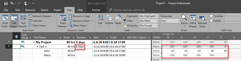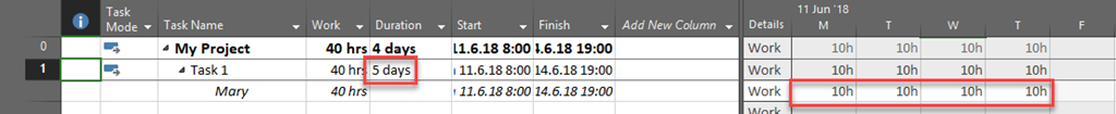 So for Mary, Total work is 40 hours (10 at Monday, 10 at Tuesday, 10 at Wednesday, and 10 at Thursday). Duration of the Task is 40 hours (Total) / 8 hours per day = 5 days.