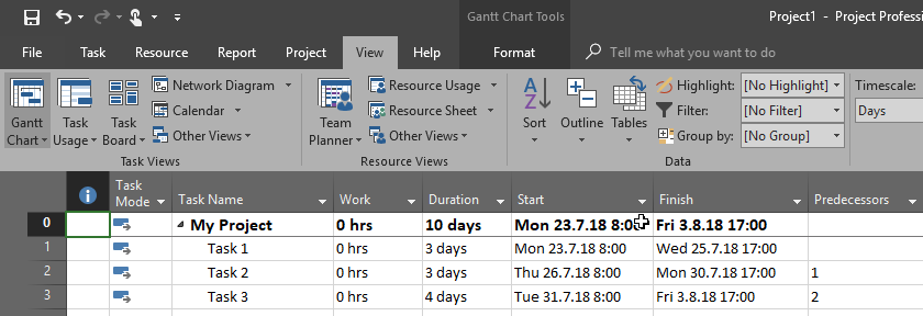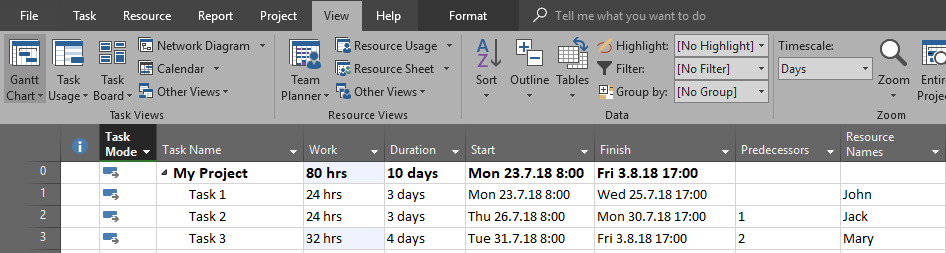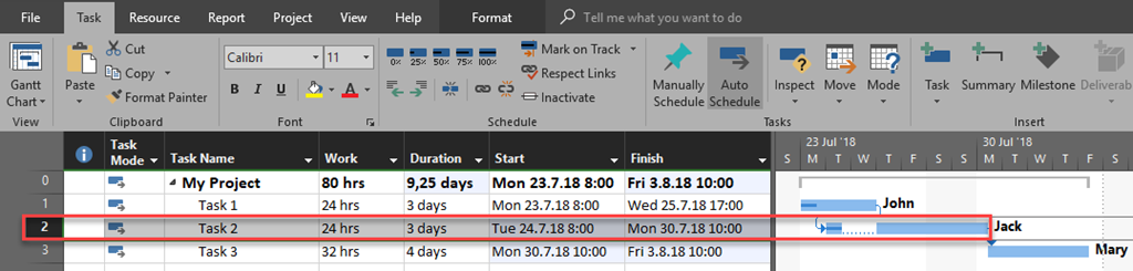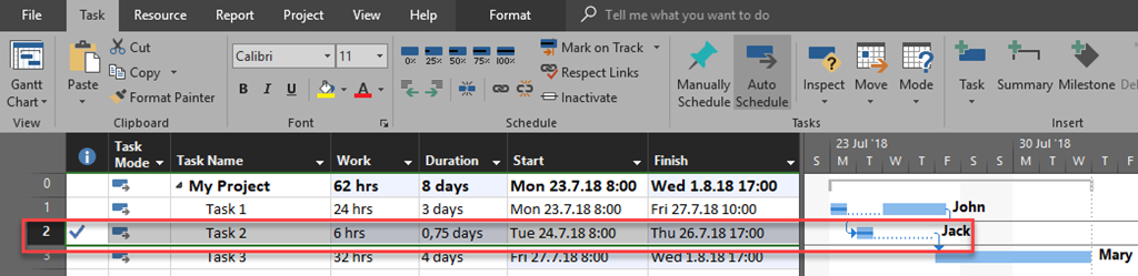 - This means that Task 2 has no work left, so it was needed only 25% of original estimated work, and this is 0,75 days and 6 hours! If you have expected that those 2 days (25.07.2018, and 26.07.2018) work will be performed, you were wrong and this is because nothing is supposed to be done at that dates because Task 1 was not finished at that time. So the earliest date on which work on Task 2 is supposed to be done is 27.07.2018, and this is before the finish date of Task 1 which is 26.07.2018