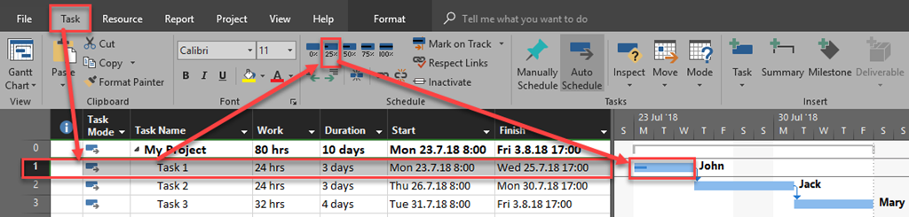 In the Mark on Trask -> Update Tasks dialog box I will enter 25% Complete , the earlier Actual Start Date for Task and click OK: