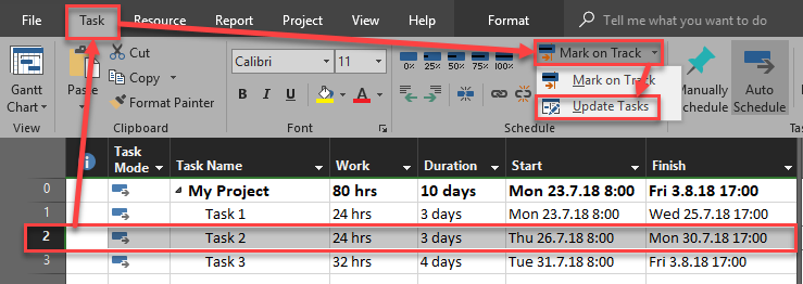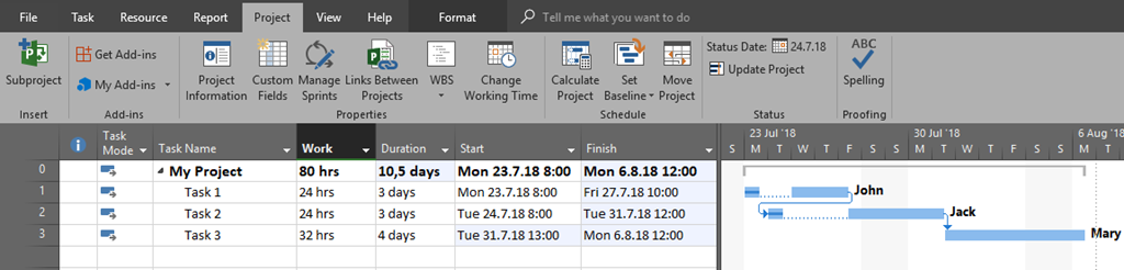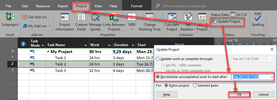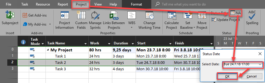 Now, I will put status date to 24.07.2018, and then I will update the project to reschedule uncompleted tasks to after the Status Date: