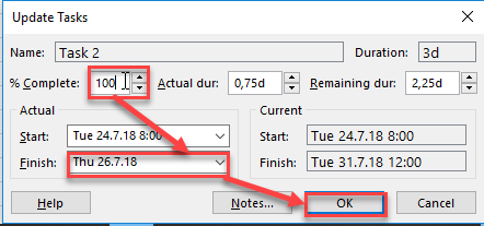 - BUT! I put 100% at %Complete, and Finish date to 26.07.2018. which is before Task 1 was finished.