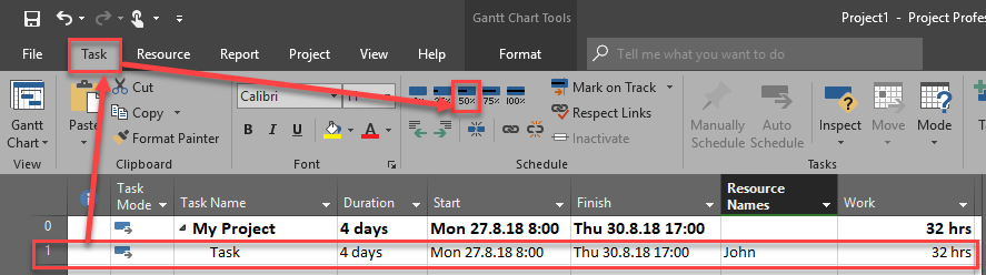 So, back to the Case. If we want to have a Task which has 3 days Duration and is completed 50%, we should follow next steps: