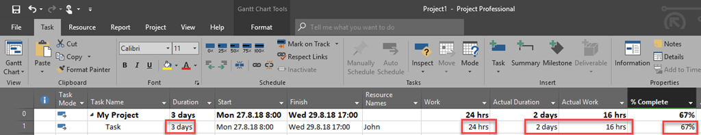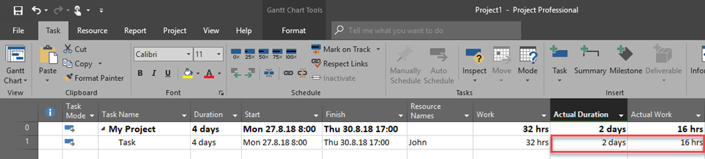 Now let’s say that we made a mistake. Task was originally meant to have Duration 3 days, and Task is 50% completed.