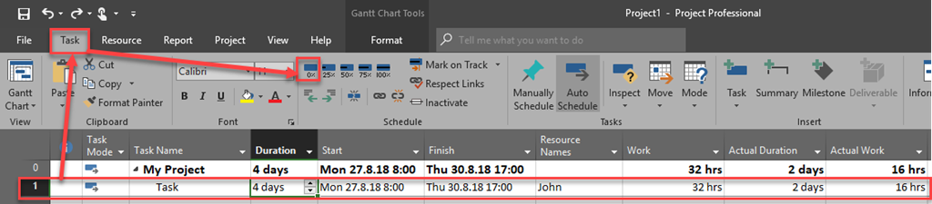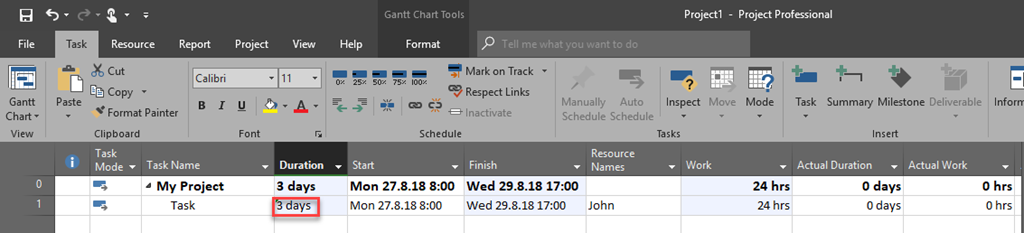 Let’s say that we have a one Task Project, with 4 Days Duration, and John is supposed to work on that Task: