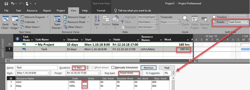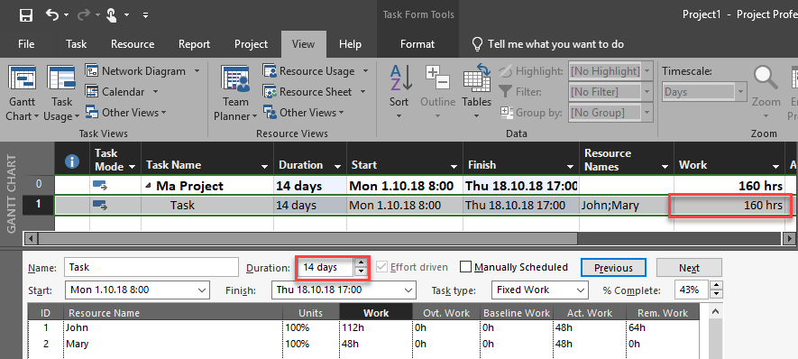 I’ve got a question from one of my blog readers: “Let’s suppose that I have a task “Task” with fixed work task type. Duration is 10 days. I assign 2 resource who work for 8hr per day. Total work is 160hr. After 6 days, found person2 is leaving. I expect MS PROJECT project to assign 64hr by default to existing 1 person and extend duration from 10 days to 14 days. Also I expect work 160hr remains same. Is MS PROJECT does it by itself as task is fixed work?”