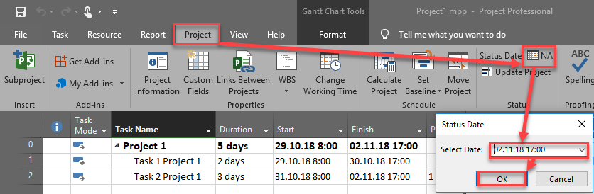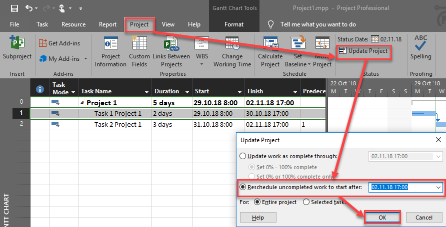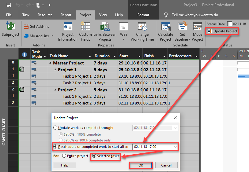 OK! Let’ say that for both Projects Task 1 is 50% completed, so I will mark them as that (I’m not going to show you the picture how to do that!). Now let’ say that Status date is 02.11.2018. Now I want to reschedule uncompleted work after that status date for both Projects at once!