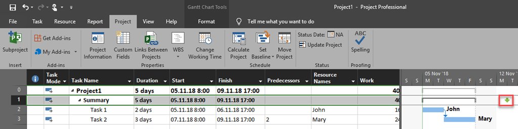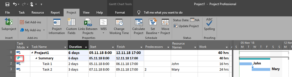 I am going to create simple Project with tow Tasks under one Summary Task, and I’m going to assign two different Resources to those Tasks: