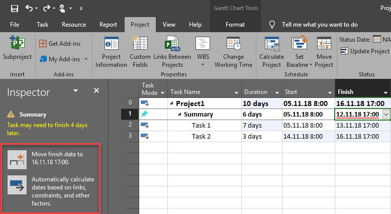 Here I have two possibilities. I can move the finish date according to subtask calculation, or I can switch Summary Task back to Auto scheduled Task.