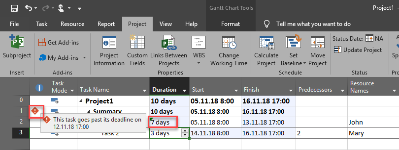 I never change any field in summary Task, but also, I want to set a deadline for it. Instead of changing duration or Start/Finish Date I put Deadline like: