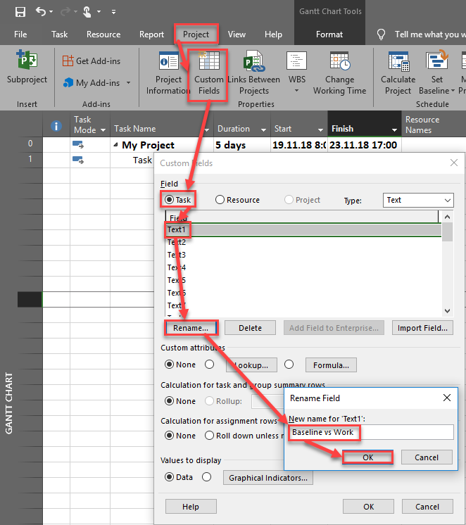 To do that I will create custom field called – Baseline vs work: