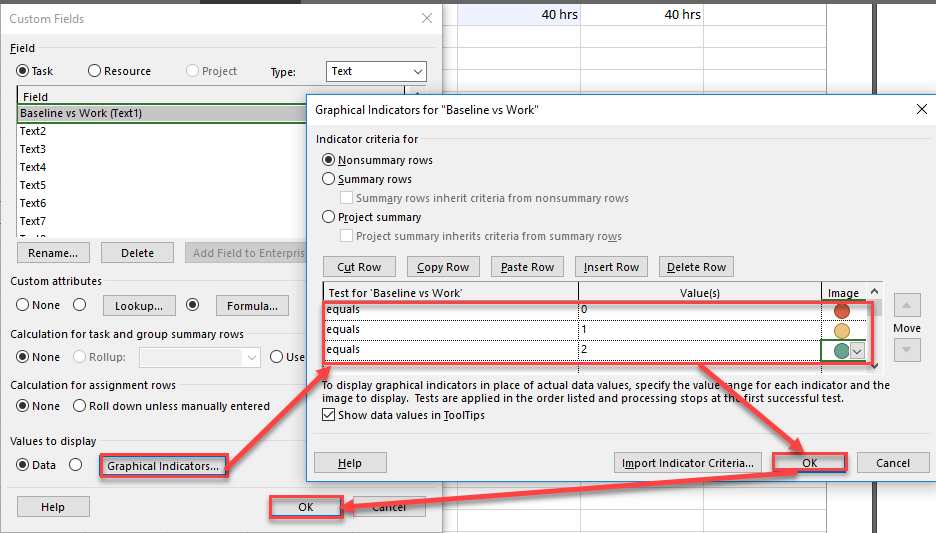 As you can see Baseline Work and Work are the same for now. I want to make a Traffic light which will show: