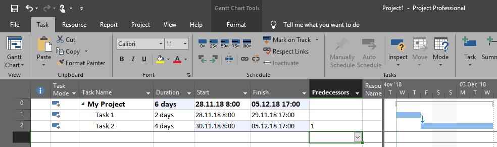 The other question was is it possible that Task 1 can continue after Task 2 is finished? It means that Predecessor can be worked on after successor is completed! And here I can’t show you example because it is just impossible! First , it is impossible to establish two or more different relations between two Tasks, and second it is impossible to control work on one Task depending on completeness of the other Tasks!