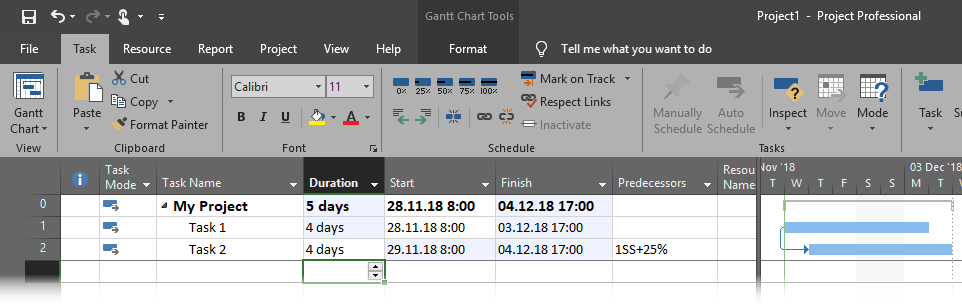 Notice that I put 4 days for Task 1 duration just to show you that Task 2 will start 1 day latter then Task 1 (which is 25% of duration of Task 1).