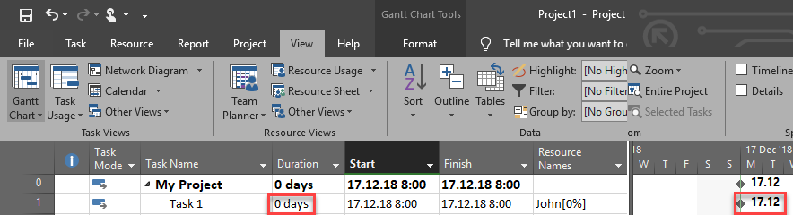 in April this year I wrote a blog post about Resource with assignment 0%–what is it?. Now I have a question Blog reader: “I am trying to use Resources with a 0% Max as a placeholder/generic resource allocation. When I assign the resource, it defaults the assignment unit to [0] and makes the task act like a milestone (no duration). I would like for the task duration to remain unchanged and for the resource to automatically assign 1 unit.”