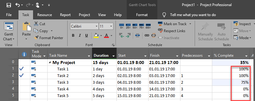 Now, let’s say that Task 1, and Task 2 are finished 100%, and Task 3 is finished 75%:
