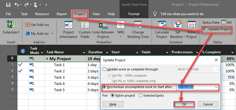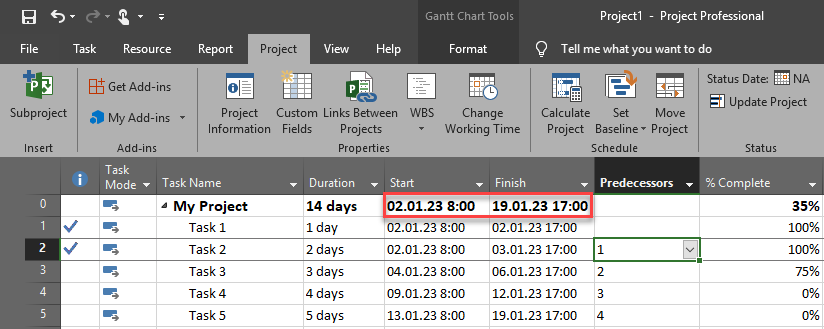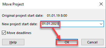 As you can see Project end date is 21.01.2019. Now, let’s say that for some reasons Project has ben postponed, and it will be restarted 01.01.2023. It is easy to put in MS PROJECT: