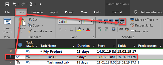 Now, lets say that Task 1 is 100% completed, and Task need Lab has 8 days actual work: