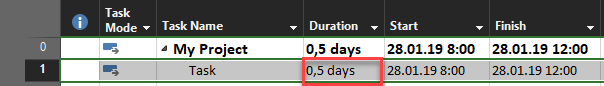 The Task has 0,5 days duration, and is supposed to be started and finished at 28.01.2019. Now let’s suppose that it started and finished one day later, e.g. at 29.01.2019. I can track this by putting start and finish date as: