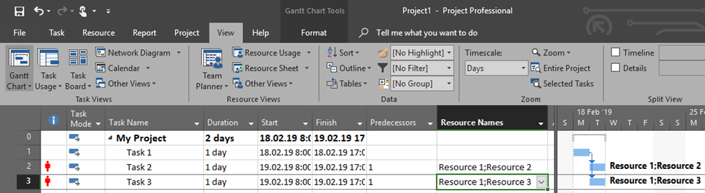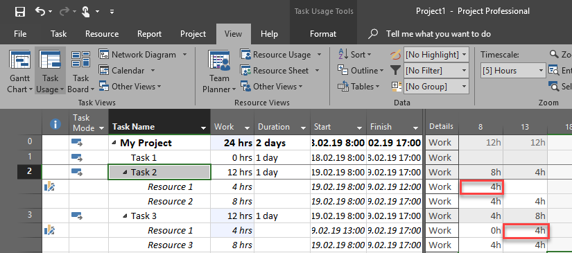 As you can see, Resource 1 is going to work during the day in a way that he/she will work 0,5 hours on one, and then 0,5 hours on the other Task! And in real life this is a rare case (I didn’t see it in my career). How to solve this? Well, hard!