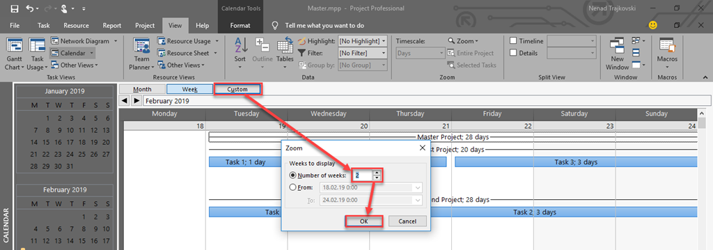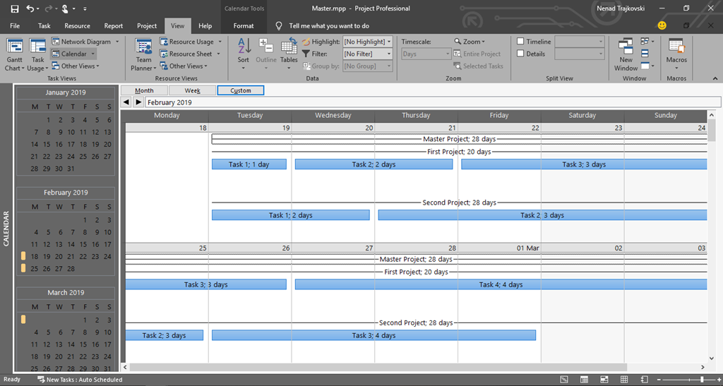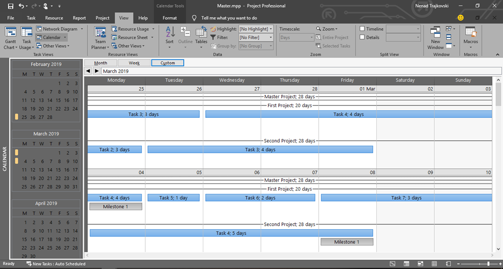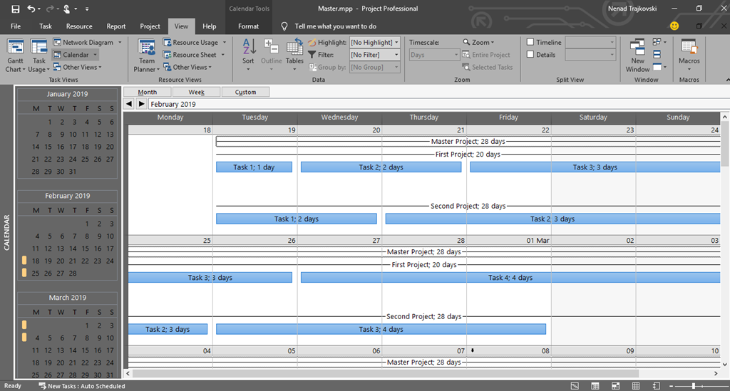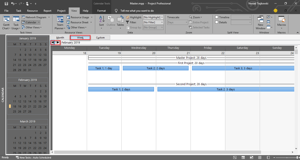 today I will show you how to see Tasks in Calendar View within Master Project, using MS PROJECT 2019.