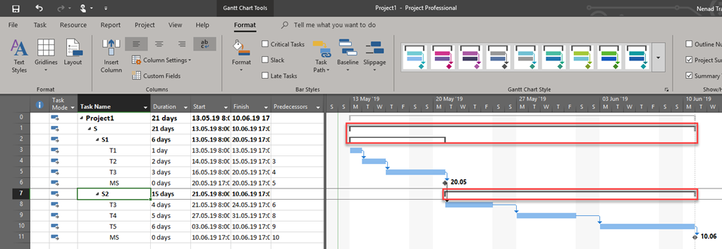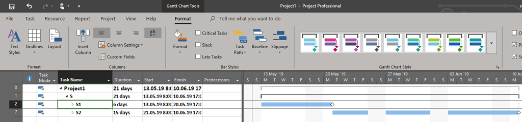 As you can see, there is one Summary Task (Task S), two Sub-summary Tasks (Tasks S1 and S2) and six Tasks (T1 to T6). finally there are two milestones (MS).
