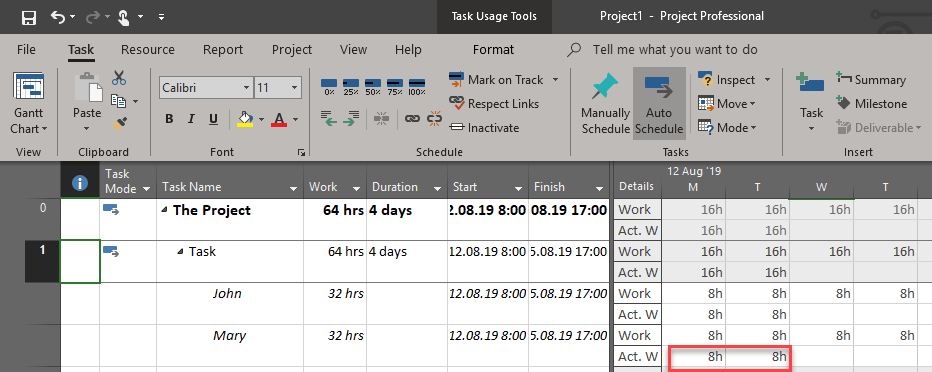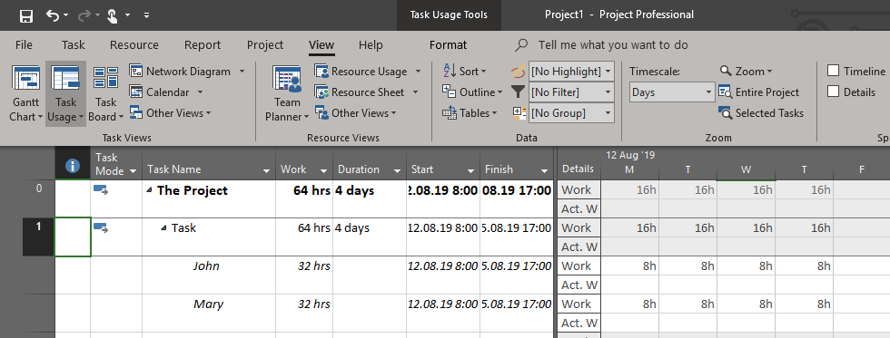 As you’ve noticed I am using Task Usage View. Now let’s say that both, John and Mary finished they work ant Monday and Tuesday, e.g. they are 50% done: