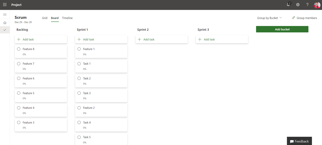 As you can see I have four Buckets: Backlog, Sprint 1, Sprint 2, and Sprint 3.