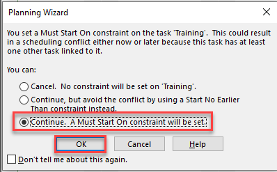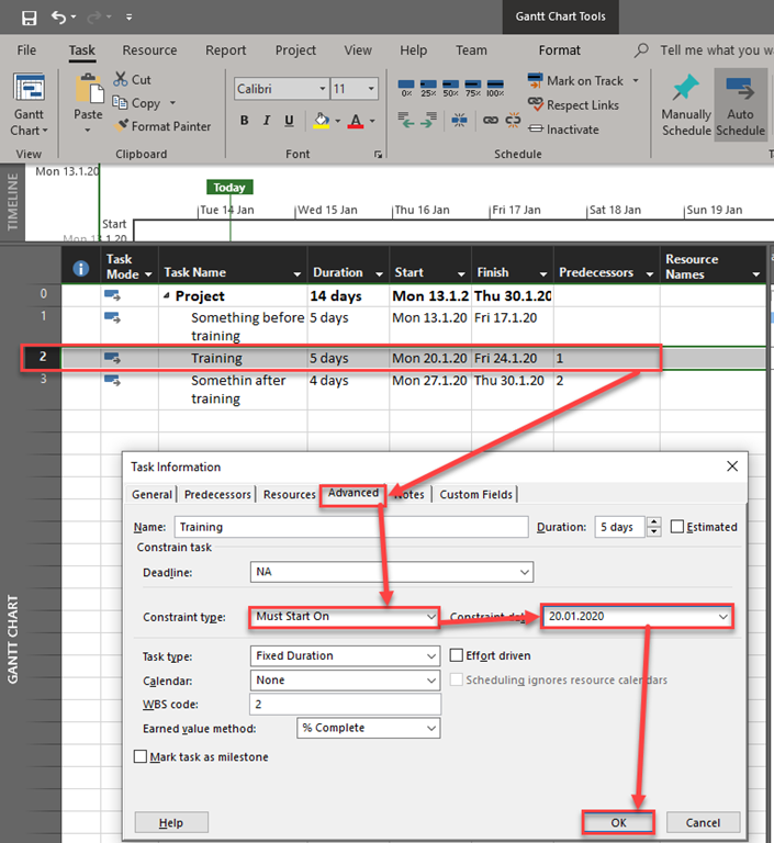 One last, but very important thing, I must mark the Training Task with Must Start on constraint, because, I as a trainer am going to start the training at Monday, January 21th no matter what. There is no postponing: