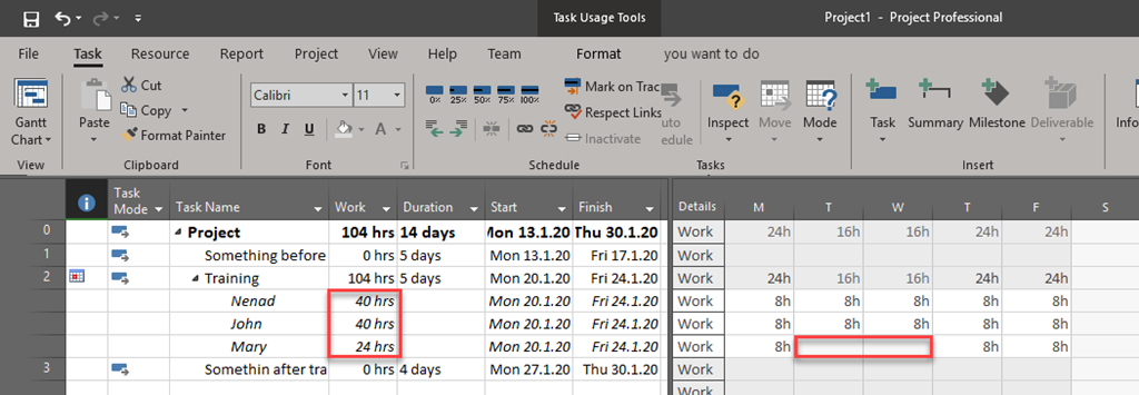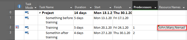 Today I will show you to use it in real life. Let me setup the Scenario. Let’s say that you need a Training for MS PROJECT and I am your Trainer. And the Training will be held USA, and I have to travel from Croatia (my homeland) to USA to train you. OK! We agreed that the training will be held from January, 20th (Monday) till January 24th (Friday). I’ve got my airplane ticket, and hotel booked, and – that’s it. No change in schedule. Here is the Project: