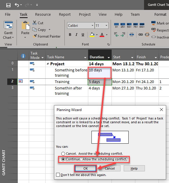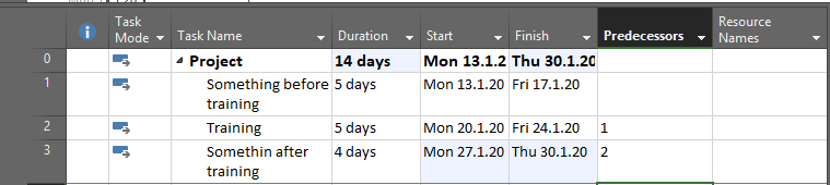 As you can see, Training is just a part of a Project. There is a Task before the training, and after the training. I want to make sure that, no matter what will happen with Tasks before the Training task, my training does not move! First of all I will make it Fixed duration (because that’s what it is – duration is fixed):