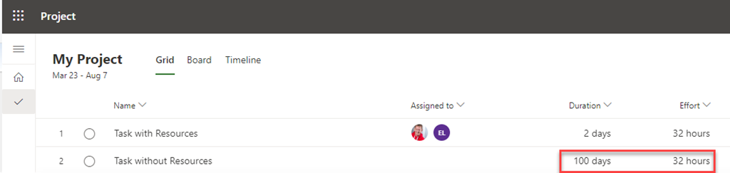 Now, I’m going to put 32 hours in effort field for Task without Resources, an when I hit Enter key, I will get: