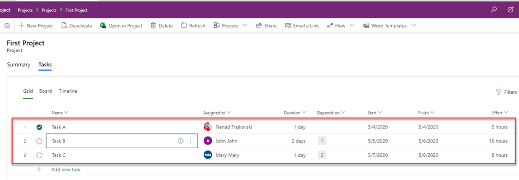 As you can see, Project is going to Start at 5/4/2020 and to Finish at 5/8/2020. Total effort is 32 hours. I will say that Task A is 100% completed: