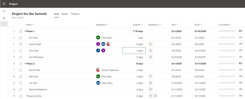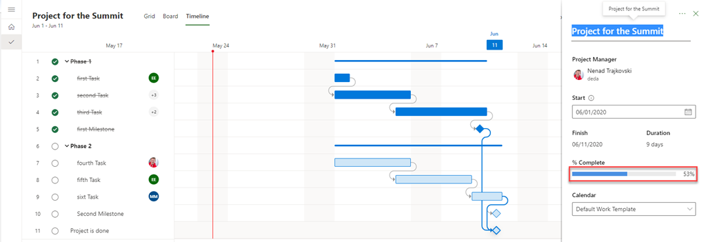 Here I can see % Completeness for the whole Project (since it is not possible to see so called “Task 0” in Project for the Web).