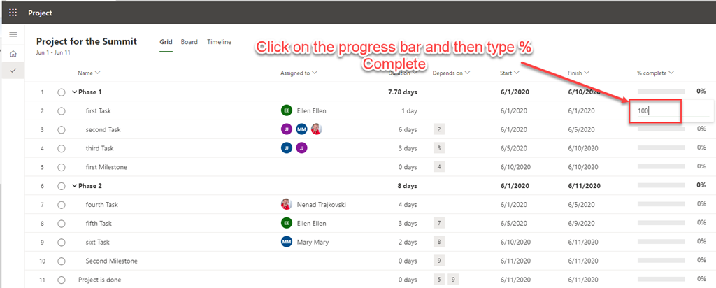 Let’s say that Phase 2 is completed as well. I can go and mark each Tasks as 100% completed (and milestone, as well), or I can go to the Summary Task and mark it as 100% completed: