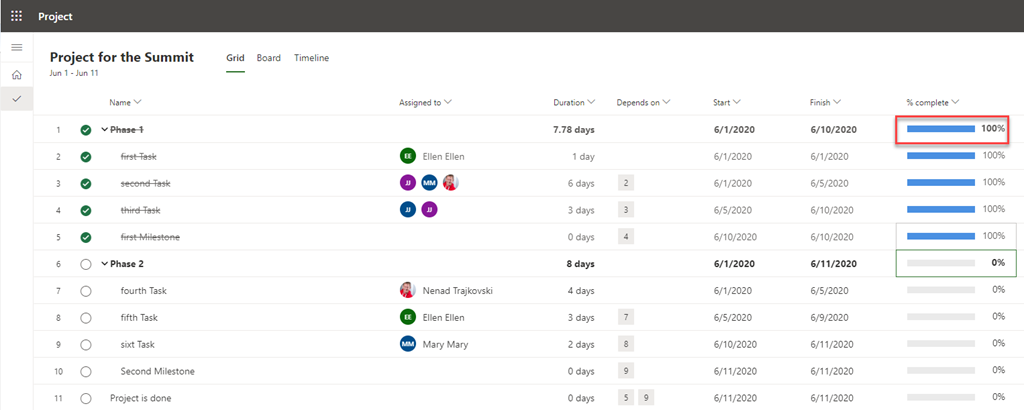 As you can see, % complete for the Phase 1 is calculated as well (it is 10%). If I mark second and third Tasks as 100% completed, I will get: