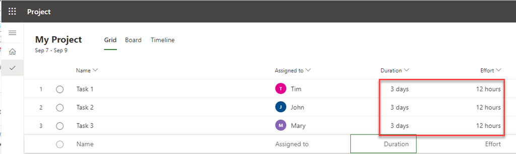 As you can see, Tasks have 3 days duration, and total effort per Resource per Task is 12 hours (3 days * 4 hours per day – from 12:00 PM to 04:00 PM).