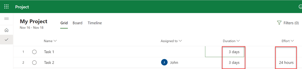 As you can see, I have two Tasks. Task 1 has no resource assigned, Task 2 has John as resource! Now, I will put three days in Duration, and I will get: